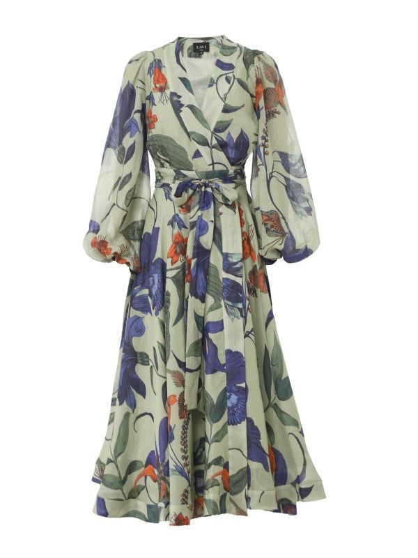 Embrace the fresh season in the vibrant, floral-printed Long Ligea Wrap Dress by Lavi. It's cut from 100% ramie with a cotton lining, featuring a deep V-neck, long balloon sleeves and a midi length. This Lavi midi dress is a wrap-over style with a matching fabric tie at the waist. This spring design is perfect for everything from weddings to garden parties.