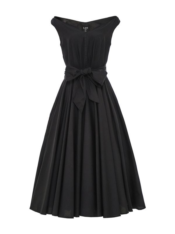 Lavi's Mambo Off-Shoulder Midi Dress is shaped with an off-shoulder neckline and short cap sleeves that sit softly on the shoulder. The waist is defined by a wide tie sash that can be knotted into a bow, leading to a full pleated skirt that falls to a midi hem. Subtle Center-front pleating and gentle gathers create fluid movement through the skirt. Ideal for dressed-up summer events, this silhouette balances a fitted bodice with a voluminous skirt for considered proportion. It also suits evening occasions.