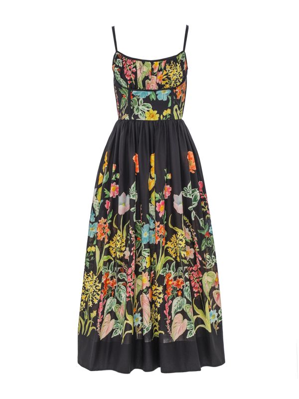 The Tarante Floral Midi Dress by Lavi pairs structured tailoring with a generous gathered skirt. It has slim adjustable straps and a panelled, piped bodice that defines the waist, leading to a full midi skirt printed all over with botanical motifs. The back features a smocked section for ease and a concealed Zipper for a neat finish. The style is lightly lined for comfort and works well with both heels and flats for day-to-night dressing.