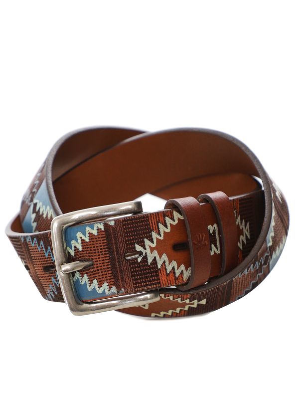 The brushed silver-tone buckle adds a touch of sophistication, seamlessly complementing the printed tribal pattern that intricately adorns the belt's surface. With a width of 35mm, it strikes the perfect balance between statement and subtlety, making it a versatile accessory for any occasion. Imbued with the spirit of tradition and modernity, the Leyva tribal belt stands as a testament to timeless style and artisanal expertise.
