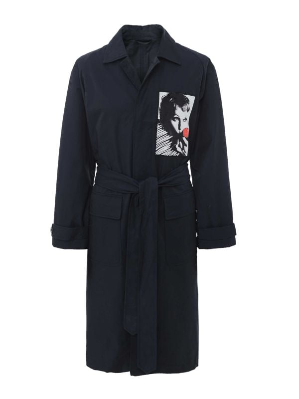The Limitato Belted Long Coat offers a contemporary, longline silhouette with a self-tie waist for adjustable shaping. Designed with a classic point collar and a concealed front placket, it features roomy flap patch pockets and a striking graphic chest patch that adds a playful contrast. Sleeve tabs with button fastening refine the cuffs while the belted waist creates versatile styling between casual and smarter looks. Tailored for menswear, the coat balances clean lines with distinctive detailing for a considered outer layer.