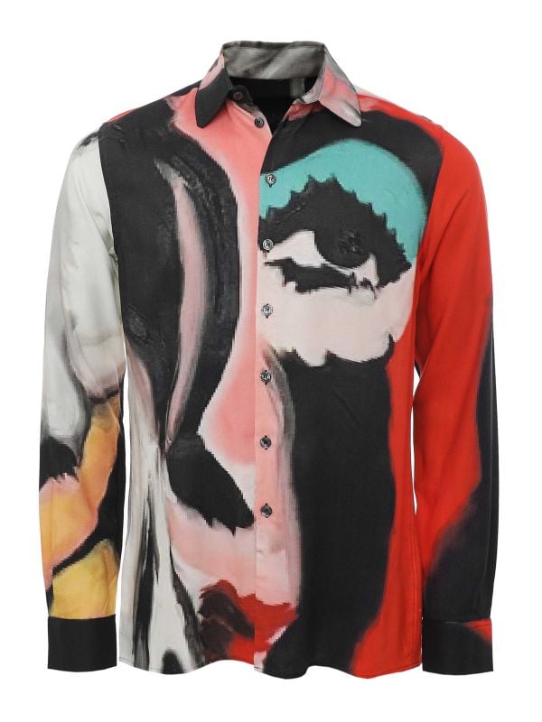 The Limitato Eye Abstract Shirt is an art-inspired long-sleeve shirt featuring an all-over abstract graphic print that maps a stylised face across the front. Designed with a pointed collar, button-through fastening and single-button cuffs, it balances bold visual impact with classic shirt construction. The lightweight drape and curved hem create movement whether worn tucked or untucked. Finished with tonal buttons and a neat placket, this piece suits edited evening looks where a strong printed shirt is the focus. Wear alone or layered under a jacket for considered urban styling.