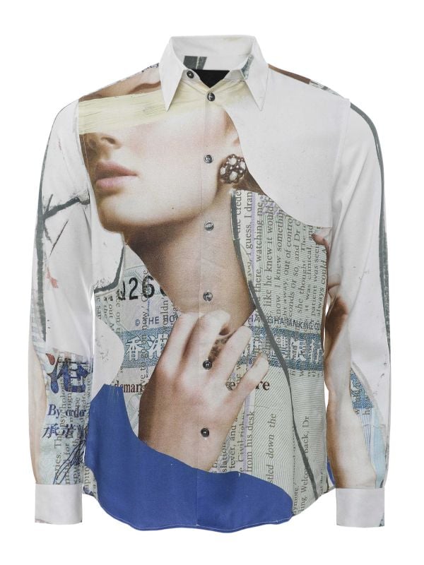 The Face On Text Shirt is a long-sleeved button-through shirt by Limitato. It presents an all-over photographic collage print that merges portraiture and text in a layered graphic composition. Tailored with a classic point collar, button cuffs and a shaped hem, it balances contemporary artwork with traditional shirting details. Fastened with tonal buttons down the front, this piece is designed for expressive styling within menswear wardrobes. Wear it under a jacket or on its own to introduce visual texture and personality to smart-casual looks.
