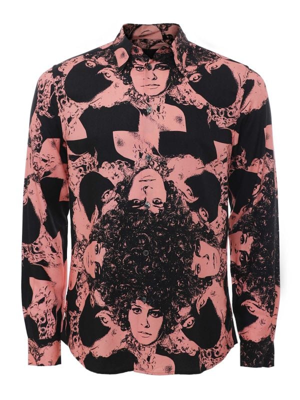 The Limitato Lady Print Shirt is an expressive long-sleeve shirt featuring a repeated graphic motif of faces. Cut with a pointed collar and button-through front, it offers a smart silhouette that layers easily under jackets or over tees. The shirt sits on a gently curved hem and fastens with small tonal buttons. Finished with buttoned cuffs and a bold all-over print, this piece brings personality to casual tailoring and evening looks without sacrificing polish. Wear it with tailored Pants or denim for different looks.