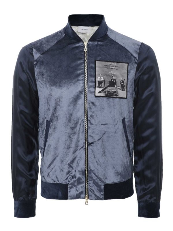 The Red Light Bomber Jacket by Limitato updates the classic bomber with textured contrasts and a graphic detail. A velvet-effect front panel meets glossy satin sleeves and a smooth satin lining, while a two-way metal Zipper and welt pockets offer practical function. A photographic chest patch adds contemporary character, and ribbed collar, cuffs and hem secure the fit. Cut in a regular bomber silhouette, this jacket layers easily over shirts or knits as an eye-catching outerwear option.