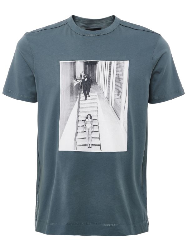 Upgrade your casual rotation with the Limitato Stairs Graphic T-Shirt. A short-sleeve crew-neck design, it features a large rectangular photographic patch appliqué with overlocked edges that introduces architectural imagery to the front. Clean tonal topstitching and a straight hem with subtle side vents provide thoughtful tailoring, while the comfortable cut keeps the silhouette easy to wear. Perfect for those who favour contemporary prints, this tee sits between art and menswear, offering a designer-led statement that suits weekend or evening looks.
