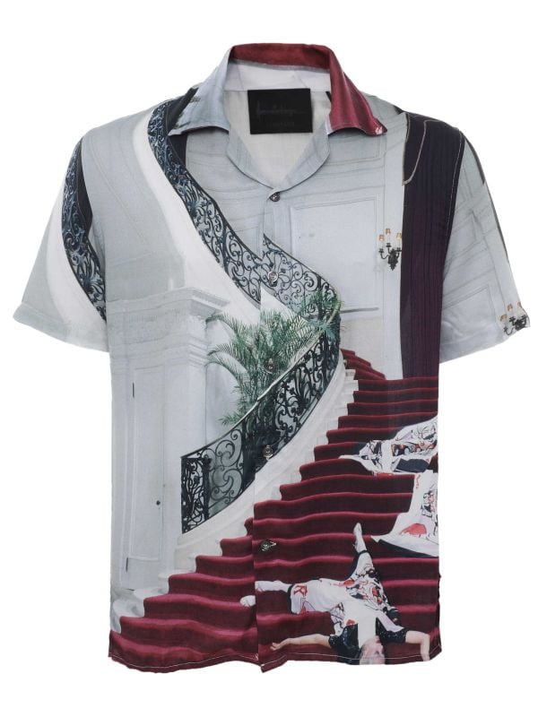 The Limitato Stairs shirt is a sharp blend of retro flair and artistic edge. Made from smooth satin fabric, it features a relaxed camp collar and short sleeves, perfect for effortless summer styling.