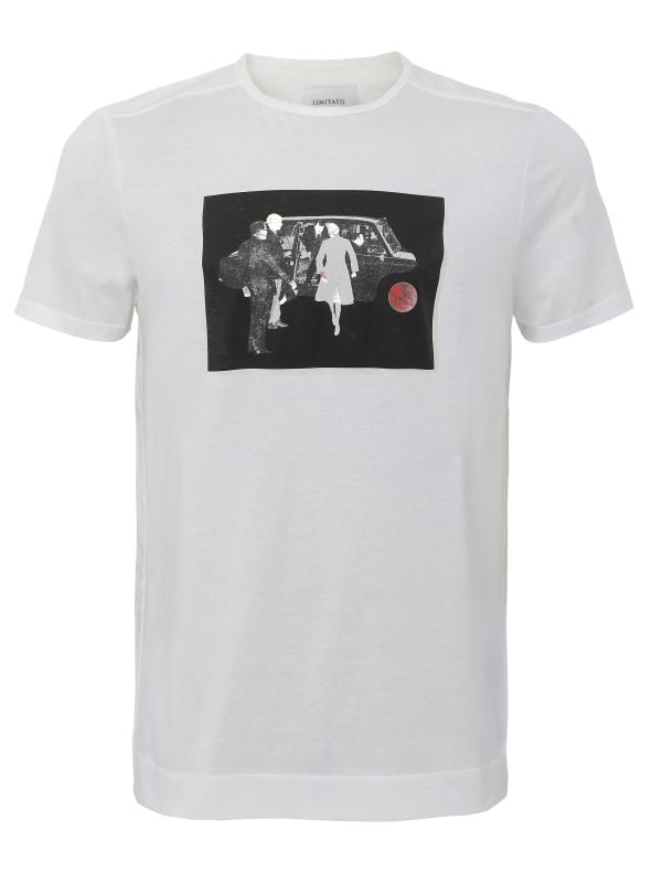 An archival-inspired tee by Limitato with a cinematic rectangular graphic to the chest. The crew neck and short sleeves deliver straightforward wearability, while the bold print adds sculptural interest to simple layering. The straight hem and regular length make it easy to pair with jeans or tailored Pants. This tee works as a focal point in casual looks — add this piece to your edit for distinctive, wearable styling.