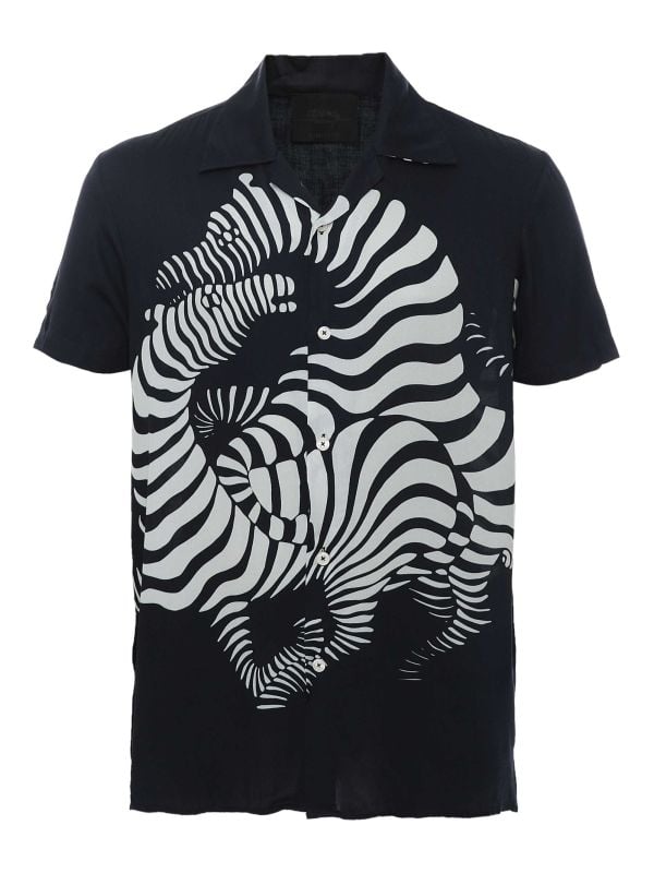 The Limitato Zebra Print Shirt is a short-sleeve revere-collar shirt defined by a bold zebra graphic across the front. It fastens with a button-through placket and falls to a straight hem with small side splits for ease of movement. The open collar creates a relaxed silhouette and the all-over print lends contemporary character to casual outfits. Button detailing runs down the Center for a neat finish, while the lightweight drape suits both layering and standalone wear.