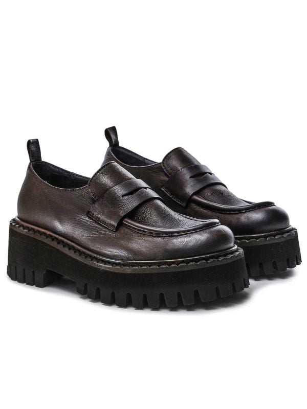 The Chunky Brogue Loafers are a bold reinterpretation of a heritage shape. Hand-crafted leather uppers sit over a pronounced lug platform, providing height and reliable grip underfoot. The moc-toe construction and penny-strap with a decorative cut-out add considered tailoring, while a heel pull tab allows easy on-and-off. They are built on a cleated platform with visible welt stitching for added durability and structure. Lofina designs these loafers to pair with tailoring, midi skirts and cropped denim for structured, confident outfits.