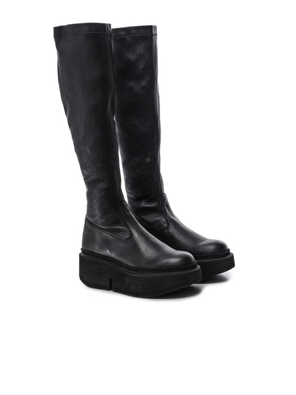 The Lofina Long Wedge Boots rework a knee-high silhouette with a bold platform wedge. Crafted from grained leather, the tall shaft fits close to the leg and is secured with a rear zip fastening finished with a branded pull. A rounded toe and stitched detailing meet a thick sculpted wedge with a textured rubber outsole for traction. The distinctive welt trim adds tactile contrast. Ideal for layering under skirts or over slim trousers, these boots give substantial height with stable, comfortable support.