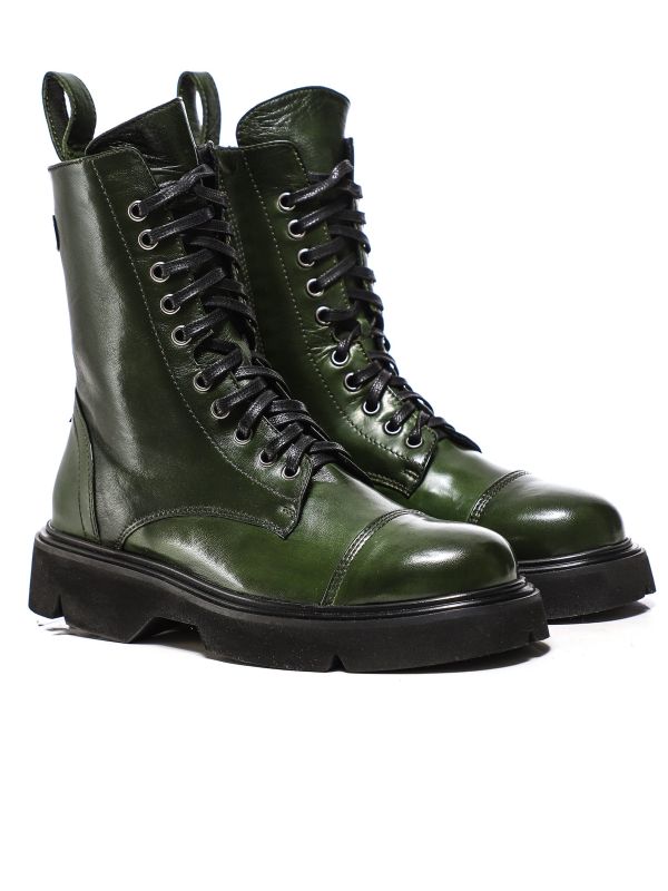 The Lorenzo Masiero combat boots draw inspiration from rugged military-issue footwear. Engineered in a smooth and supple leather, the boots exude a sleek aesthetic. Featuring a lace-up fastening, cap toe and ankle pull loop, with the chunky cleated outsole providing traction and an ultra-modern silhouette.
