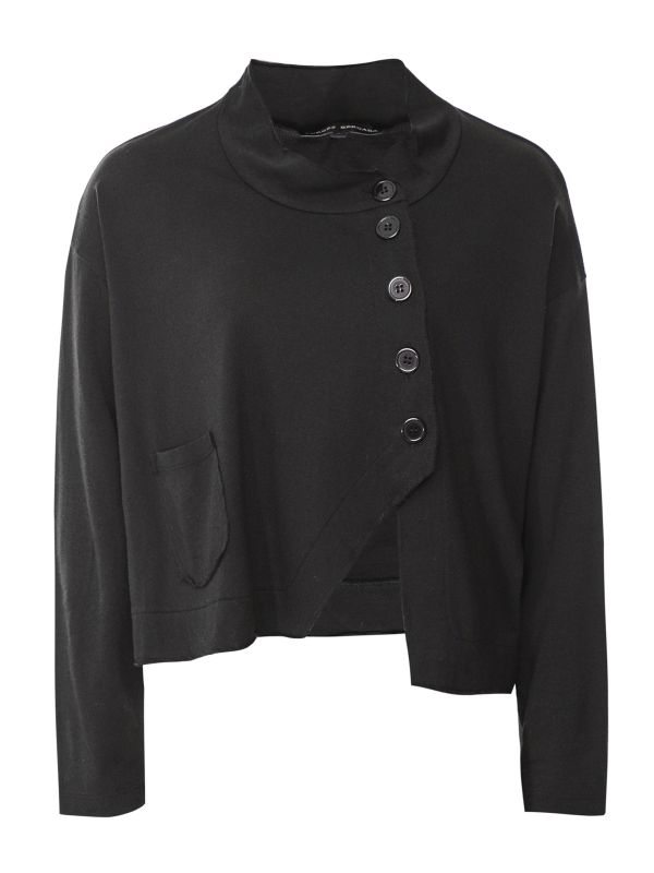 The Lurdes Bergada asymmetric buttoned top can also be worn as a light jersey jacket or cardigan. It features an asymmetric hem and button fastening, a round neck with short collar, opening at the front and a single pocket. It works well as a layering piece over t-shirts and vests.