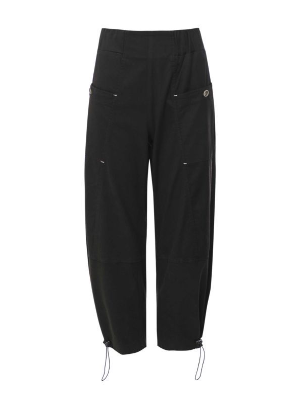 The Lea Easy trousers from Lurdes Bergada blend comfort and style. Made from a soft cotton-blend fabric, these combat-style trousers slip on and feature a wide elasticated waistband, large front pockets with button fastenings and elasticated leg endings with drawstrings for adjusting the leg shape to your desired silhouette. Wear these Lurdes Bergada trousers on casual days with a tank top and trainers, adding an extra layer in autumn/winter.
