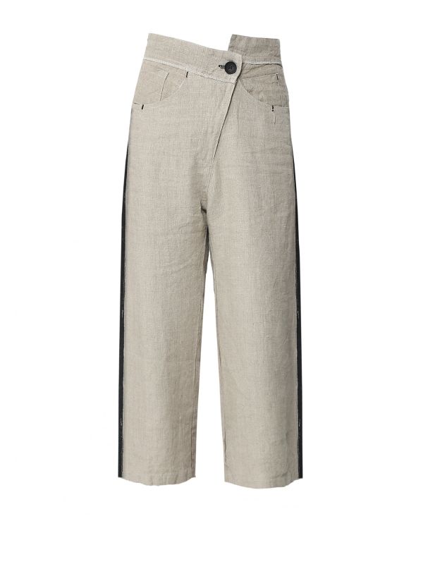 Get an elegant everyday look this season with the Lurdes Bergada contrast stripe pants. Crafted in 100% linen for a lightweight and comfortable feel, these casual pants are an essential staple for spring/summer. They feature an asymmetric button and zip fastening, front pockets and back patch pockets, with contrast side stripe details, a cropped leg and a wide leg silhouette. Team with a classic tee and sneakers on off-duty days.