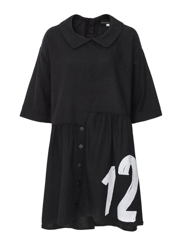 Get an effortless off-duty look with the Lurdes Bergada printed dress. Cut for an oversized fit, this laid-back piece features an overlapping collar, dropped shoulders, short wide sleeves and gathering at the waist. The dress is complete with button details at the skirt and a contrast numbers print for a quirky finish.