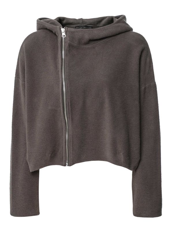 The Soft Cropped Zipper Hoodie is a relaxed, cropped sweatshirt from Lurdes Bergada. It features a generous hood and an off-Center silver Zipper for easy layering. Dropped shoulders and long sleeves create a casual, slightly oversized feel, while a gently curved, cropped hem adds movement. The brushed texture provides extra warmth and comfort, making it well suited to transitional days. Practical yet understated, the metal Zipper and minimalist lines allow it to be paired with high-waisted Pants, relaxed joggers or layered beneath a structured coat.