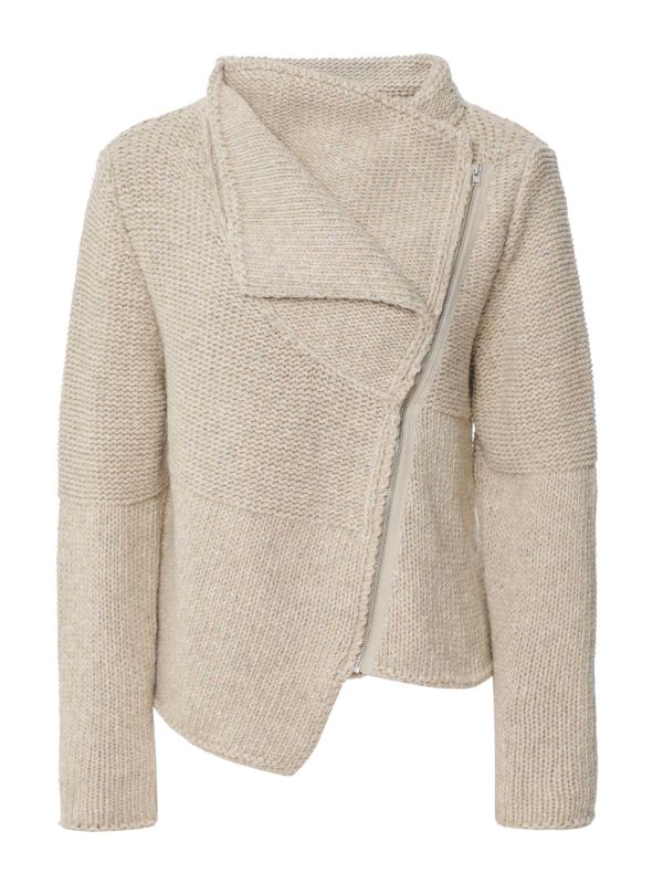 The Wool-Blend Zipper Cardigan by Lurdes Bergada reinterprets classic knitting with an asymmetric Zipper and wide shawl collar. Crafted in a chunky knitted wool-blend, it offers structure with a softly textured handle. Long sleeves and neat finishing at the hem create a relaxed silhouette for layering. Designed and manufactured in Barcelona, this piece pairs equally well with tailored Pants or casual denim. It fastens at the side for an easy, contemporary finish.