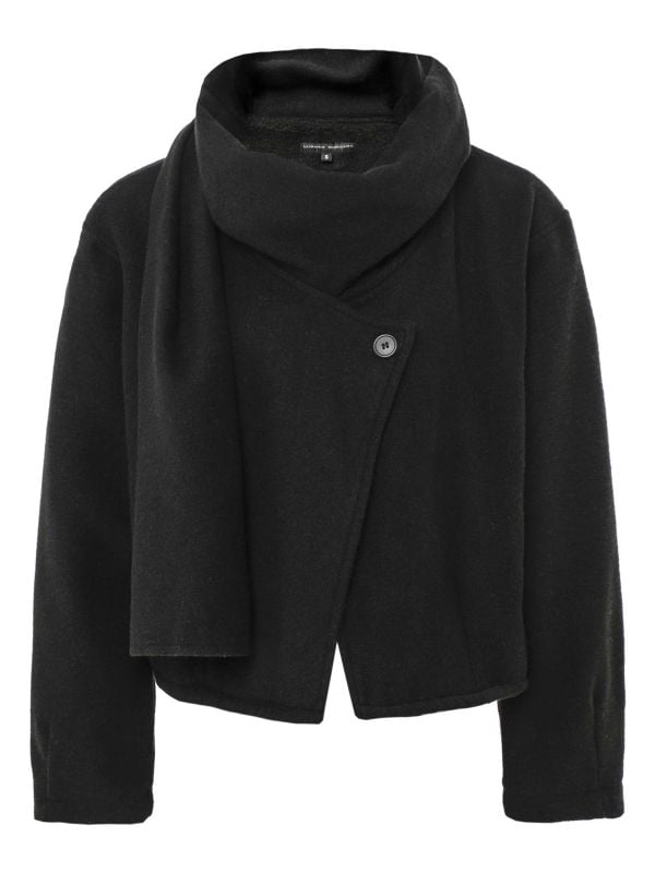 The Wool Scarf Jacket is a compact, asymmetric jacket from Lurdes Bergada. It features an integrated draped scarf collar that folds across the front, secured with a single-button fastening for a neat, layered look. The design is cropped at the hem with long sleeves and a clean, minimal silhouette that pairs well with tailored Pants or skirts. Practical and tactile, the wool-blend fabric offers structure and warmth. Ideal for layering through cooler months, this jacket brings sculptural detail to everyday outerwear.