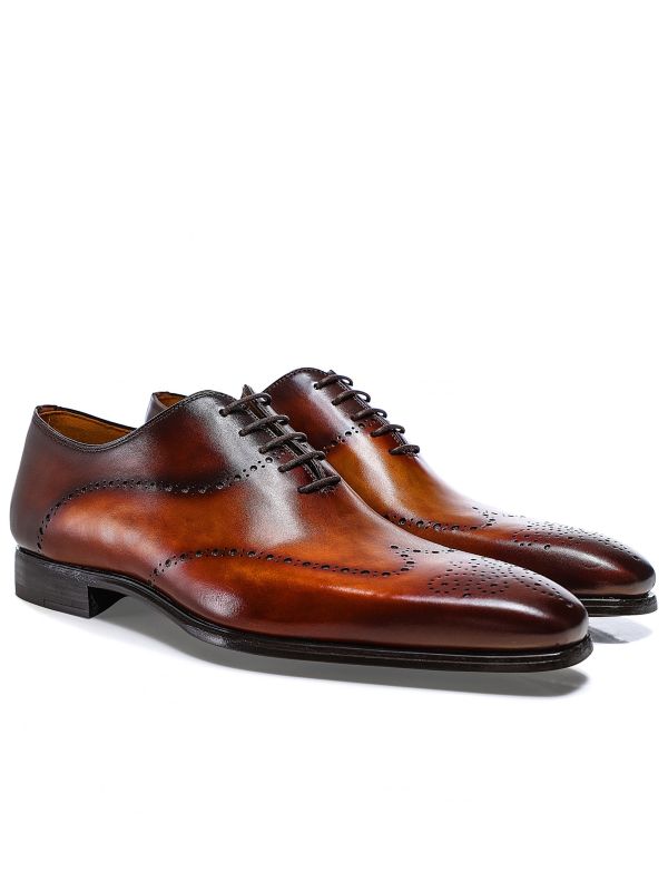 Lend your formal footwear a touch of luxury with the Magnanni Oxford shoes. Expertly handmade in Spain using a single piece of leather, the oxford shoes showcase exceptional sophistication and detail. Featuring a five hole lace-up and brogue detailed wing-tip toe, whilst the Bologna construction lovingly wraps the foot in leather for unrivalled cushioning and flexibility. The Magnanni shoes have been hand-painted giving them a beautiful depth and unique, rich patina.