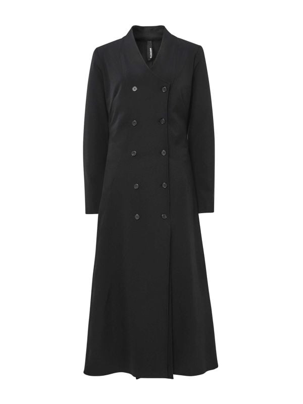The Collarless Longline Coat by Manesera is a longline, double-breasted coat that combines architectural tailoring with a clean, collarless V-neckline. Fitted seams shape the waist and flow into a gently flared skirt for a sculpted silhouette, while the double row of buttons secures the front. The front fastens with a neat row of buttons and interior facings for a smooth finish. Wear with structured tailoring or soft layers to complement its clean lines for transitional-season dressing.