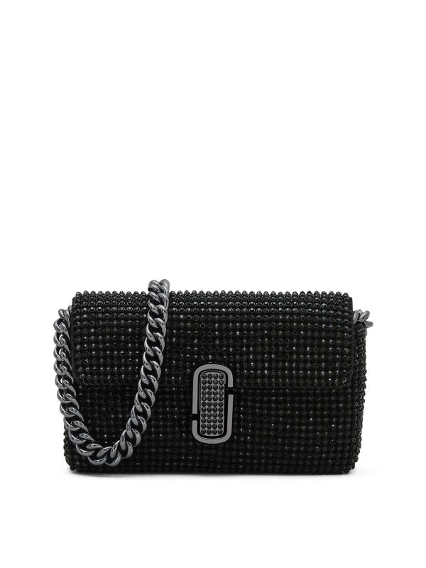 The Rhinestone J Marc Mini Shoulder Bag is a shiny new style from Marc Jacobs. Featuring all-over rhinestones and gunmetal hardware, this bag is the perfect accessory for nights on the town with its disco-esque design. The shoulder bag is complete with a magnetic closure, signature front plaque, shoulder chain strap and three interior card slots.
