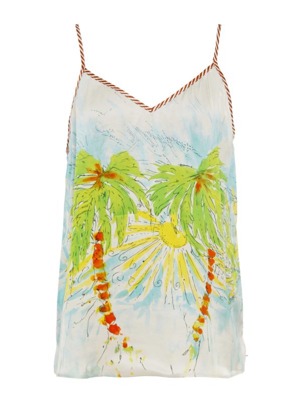 Embodying summer, Me369's Angelique Camisole is a key style for your new season wardrobe. Cut from soft and smooth viscose, this Me369 camisole has a flattering V neckline and spaghetti straps in a contrasting stripe pattern. It features the brand's Pura Vida print with tropical palm trees on the front and a blue zigzag pattern on the back. Style yours with jeans or dress it up with a midi skirt.