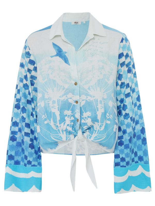 The Me369 Ayla Tie Shirt is a relaxed button-through shirt crafted from a linen-Rayon blend with a lightweight, breathable feel. It features a classic collar, mixed botanical and geometric prints and a front tie that creates a cropped, casual silhouette. The long sleeves finish in wide cuffs and the shirt fastens with tonal buttons for ease. Wear it with high-waist Pants, layered over a dress or knotted with denim for versatile seasonal styling that moves from day to evening and beyond.