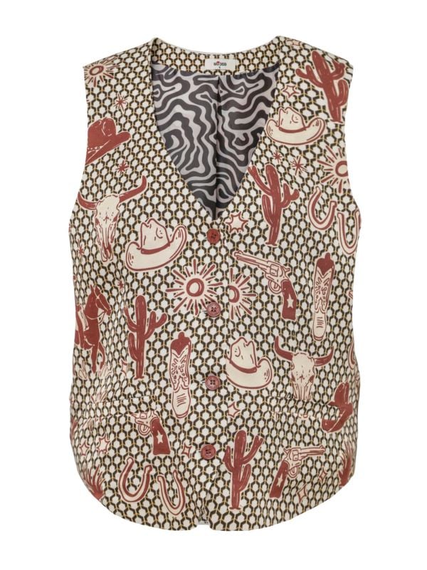 Keep your looks fresh with Me369's Cameron Rodeo Vest, a vibrant printed style with endless styling potential. Crafted from viscose, this Me369 vest is smooth and lightweight, making it ideal for styling alone or layering over shirts and blouses. It features a deep V-neck, button closure and the brand's detailed rodeo print on a geometric base.