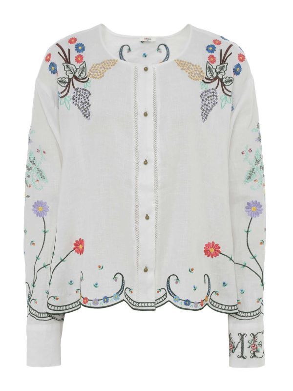 The Me369 Helena Embroidered Shirt is a lightweight linen blouse that marries artisanal needlework with wearable detailing. It features a round neckline, a button front with openwork trims and a scalloped hem. Floral embroidery decorates the shoulders, sleeves and hem for a hand-stitched effect, while long sleeves finish with embroidered cuffs and metal stud fastenings. Layer over jeans or pair with tailored linen Pants for a coordinated set. Ideal for warm-weather days, it adds texture and artisan detail to your looks.