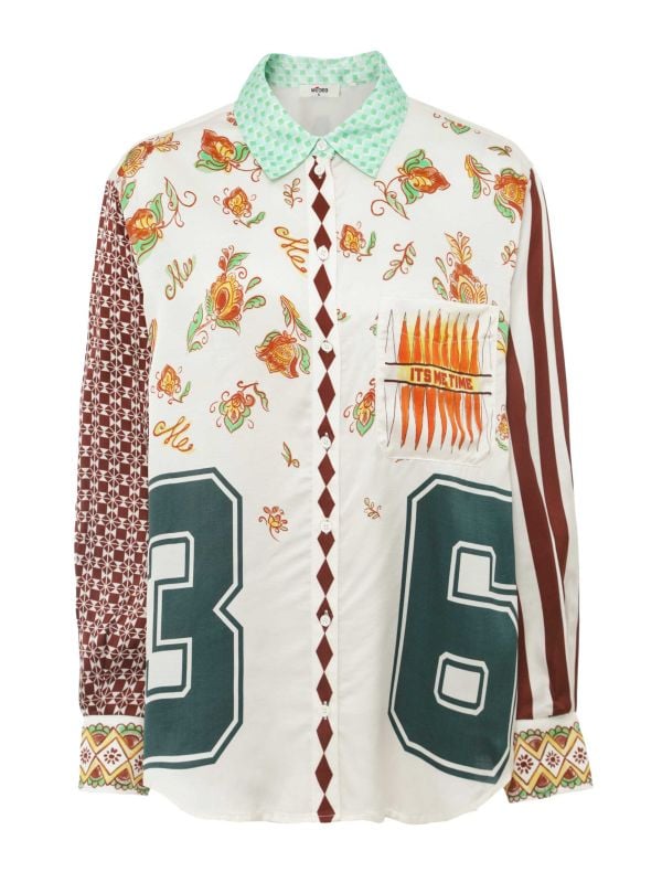 Stay stylish every season in Me369's Isabel Sporty Jade Shirt. This Me369 shirt is crafted from 100% viscose and features classic shirt details including a collar, button closure, long sleeves and a single pocket on the chest. This style is covered in vibrant patterns and contrast sleeves, finished with a “Ready When You Are” graphic across the back.
