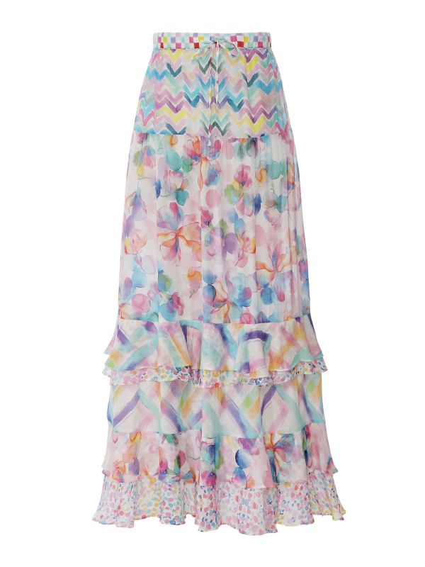 The Jasmine Ruffle Skirt from Me369 is a maxi-length skirt crafted from lightweight Rayon panels. It features tiered ruffle layers and mixed floral and geometric print bands that create movement and textural interest. An elasticated waistband with a drawstring allows an adjustable fit while subtle pleating adds gentle volume through the silhouette. The flowing hem moves beautifully, making it suitable for daytime occasions or relaxed evenings. Pair with a fitted top or camisole for balanced proportions and soft, layered styling.