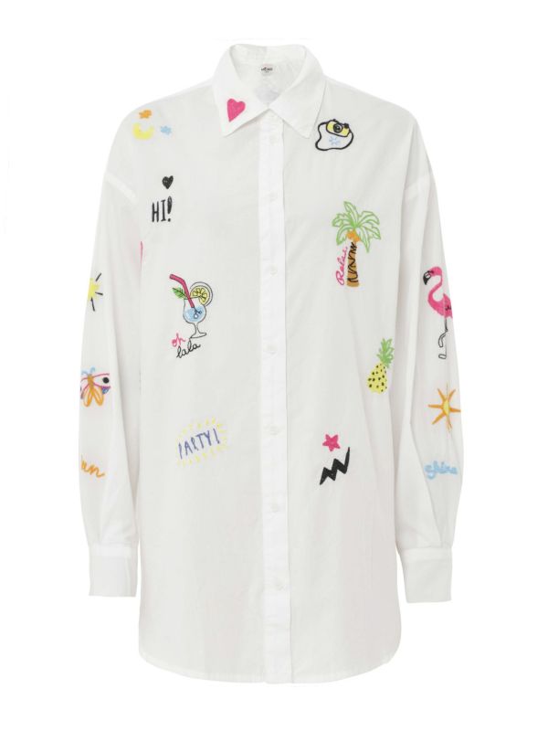 Me369's Madison shirt is an oversized style cut from 100% cotton. It has a button-down front with a pointed collar, long sleeves and cuffs, and a hem that falls longer at the back. This Me369 shirt is adorned with a variety of small embroidered motifs including bananas, cocktails, hearts and palm trees, all in bright colours. Wear this shirt to bring a touch of fun to your looks.