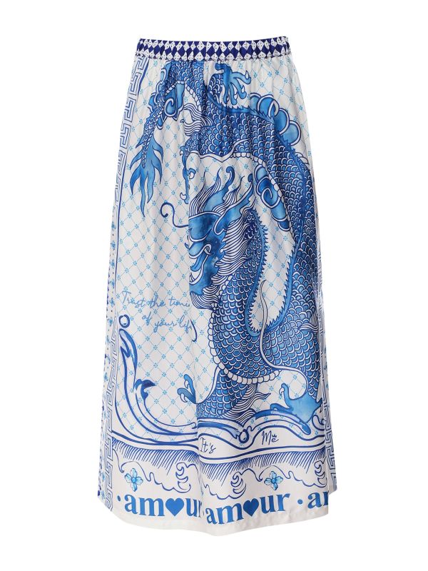 Available in a captivating blue option featuring a mesmerising mix of geometric patterns and a stylised dragon print, or the multi-option sea life print for a whimsical touch of the ocean. The slogan print hemline adds a playful twist to its overall charm. Whether paired with a simple tee or dressed up with a blouse, this skirt effortlessly exudes confidence and sophistication, making it a must-have for those who crave a statement piece for the summer season.