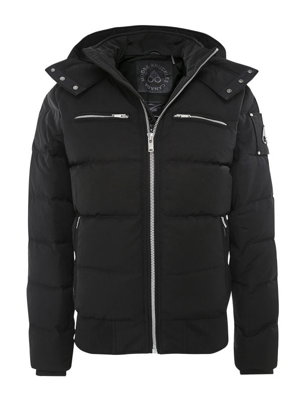 Brace the colder months with the super comfortable Moose Knuckles bomber jacket. Crafted from a cotton-polyester blend and filled with down and waterfowl feathers, this jacket is essential for maximum warmth. With four external pockets, a detachable and adjustable hood, and a single internal pocket, the Moose Knuckles jacket offers functionality as well as style.