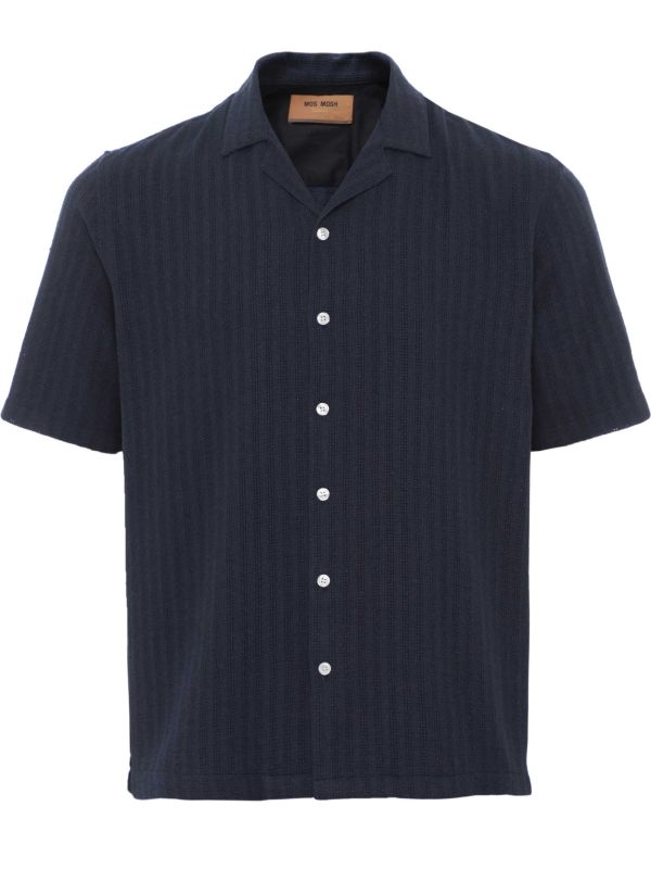 The MOS MOSH MMGJoe Basso Stripe Shirt is a relaxed revere-collar design crafted in a textured knitted construction. It fastens with a button-through front and features short sleeves and a straight hem, creating a smart-casual silhouette that layers easily. Tonal vertical texture adds subtle interest while white four-hole buttons deliver a crisp finish. An internal contrast yoke lining improves comfort. This shirt suits weekend and travel wardrobes where breathable construction and understated detailing are appreciated.