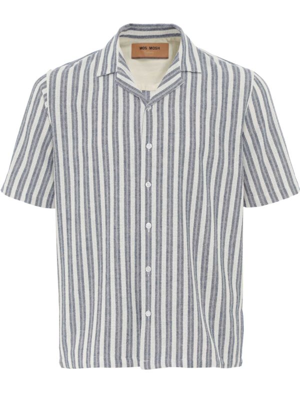 The MOS MOSH MMGJoe Basso Stripe Shirt is a lightweight short-sleeve shirt with a relaxed camp collar and button-through front. Woven in a textured cotton-blend with an open weave, it offers breathability and subtle structure while vertical stripes provide a linear finish. Finished with simple white buttons and a straight hem, the shirt sits comfortably for warm-weather wear. Pair with light Pants or tailored shorts for daytime dressing, or layer over a tee for an easy evening outfit with a smart-casual edge.