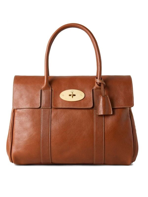 The Bayswater Leather Shoulder Bag is a structured everyday bag by Mulberry, crafted from the label's Legacy NVT leather. A gold-tone oval turn-lock secures the flap while two rolled top handles offer hand or crook-of-arm carry. The open interior gives easy access to daily essentials and the secure fastening keeps belongings protected. Inside, a zipped pocket and slip pockets help keep items organised; a leather clochette houses the padlock. Made in England, this piece features neat contrast stitching and considered detailing from Mulberry.