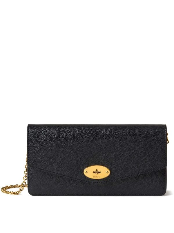 The Darley Clutch Bag from Mulberry is a compact envelope silhouette designed for evening and day-to-day use. It has a flap with a gold-tone oval turn-lock fastening and a chain shoulder strap for hands-free wear. Inside, a zipped pocket and slip compartment keep essentials organised, while the pebbled textured exterior provides structure. A small logo completes the design. Neat proportions make it suitable for cards, a phone and small items, pairing well with tailoring or relaxed daytime looks.