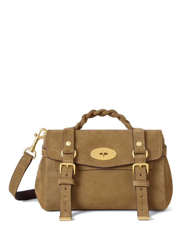 The Mini Alexa Suede Satchel Bag is a compact everyday style from Mulberry. Designed with a braided top handle and an adjustable, detachable shoulder strap, it offers versatile carry options. The front flap secures with the brand's signature turn-lock fastening, while the interior contains a zip pocket and fabric lining to keep essentials organised. Polished brass hardware and branded clasp detailing give the bag a considered finish. Practical and neatly proportioned, this small suede crossbody is ideal for hands-free days and refined city dressing.