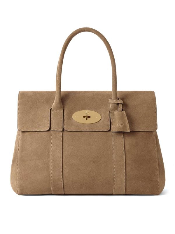 The Suede Bayswater Tote Bag is a Mulberry design rendered in suede with a structured, practical silhouette. It has a front flap with the brand’s signature turn-lock fastening, two rolled top handles and a leather hang-tag stamped with the tree emblem. The interior is fabric-lined and includes a zip pocket to keep essentials organised. Vertical strap detailing reinforces the shape and the gold-tone hardware adds a subtle finish. This Mulberry tote works well for everyday carrying when you need both form and function.