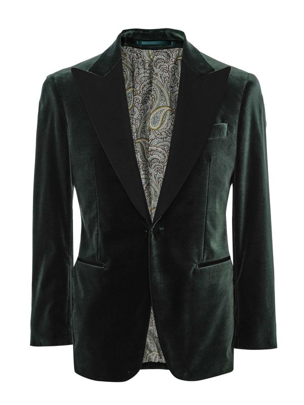 Munro's Dinner Jacket is cut from a cotton-blend velvet and shaped with contrast satin peak lapels for classic evening tailoring. Tailored with a single-button front, jetted pockets and a chest welt, it is finished with fabric-covered cuff buttons and a paisley patterned lining. The silhouette sits neatly through the body for evening dressing and pairs well with tailored Pants. This jacket balances formal detailing with considered comfort, offering a smart option for events and after-dark occasions.