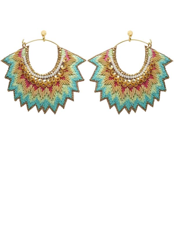 The Nahua Maria hoops are a statement pair of large earrings. Hand-embroidered with silk thread, pearls, brass beads and sequins, these hoop earrings have a metallic pointed trim and multi-coloured patterns. Complete with a leather lining and stainless steel and anti-allergenic brass hooks, these hoops will become your go-to this season.