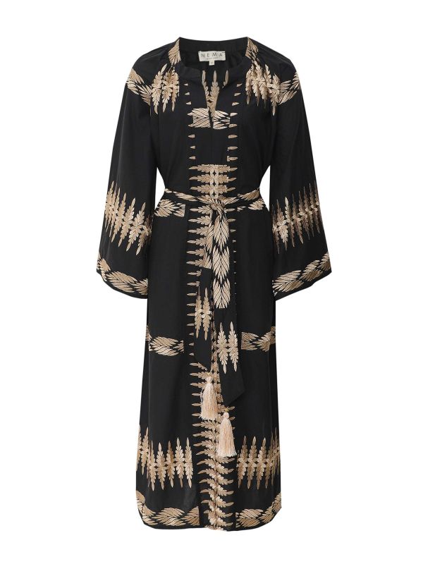 The Nema Eliana dress is a true statement piece for your spring/summer wardrobe. Crafted from cotton, this elegant dress is cut to a midi length with a flattering V neckline, wide flute sleeves and a matching self-tie waist belt with large tassels to the ends. Gold embroidery covers the dress in a mixture of delicate feather shapes. Use the belt to cinch the waist to your desired fit or keep it loose and floaty.