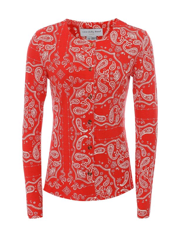 The Bandana Alexa Cardigan from Never Fully Dressed is a ribbed, button-through cardigan that combines a fitted silhouette with graphic bandana paisley print. It has a round neckline, long sleeves and tortoiseshell-effect buttons running down the front. Panelled seams create a shaped fit, making it ideal for layering over a camisole or pairing with tailored Pants or a matching skirt for coordinated looks. Perfect for adding texture under coats or worn alone as a statement layer, it offers easy comfort for seasonal dressing.
