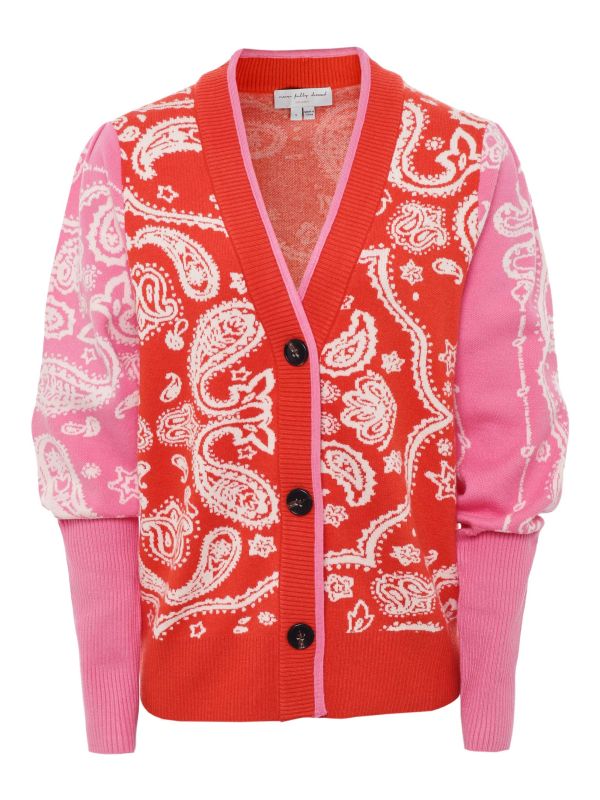 The Never Fully Dressed Bandana Martha Cardigan reinterprets a paisley bandana motif into a knitted cardigan with a relaxed V-neck and front button fastening. It features voluminous sleeves that gather into long ribbed cuffs and ribbed trims at the hem and placket for a neat finish. The jacquard intarsia pattern extends across the body and sleeves for a coordinated look; style it over simple tees or with the matching trousers for an outfit tie-in.