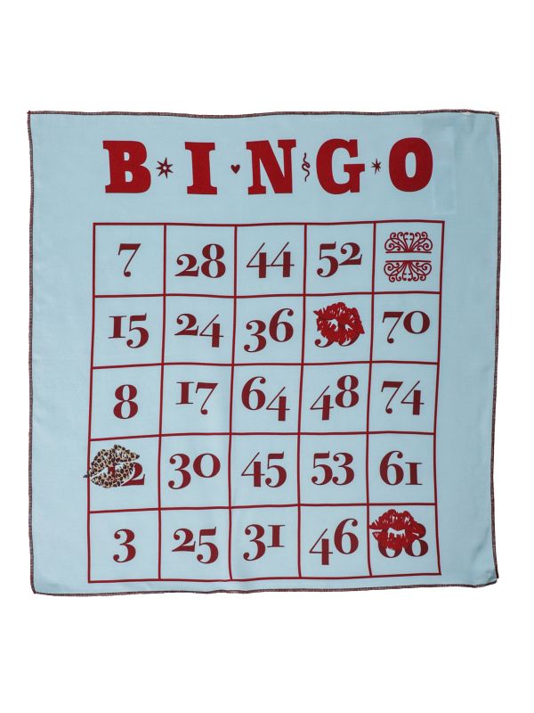The Bingo Bandana Scarf from Never Fully Dressed is a playful, square bandana designed for knotting at the neck or tying to a bag. Printed with a bingo-card grid and decorative kiss motifs, it features a narrow stitched edge and a lightweight, fluid drape that sits smoothly when worn. The compact size makes it versatile for styling as a petite neck scarf, head tie or accessory accent. Wear it knotted for instant character or let it peek from a collar for a curated finish.