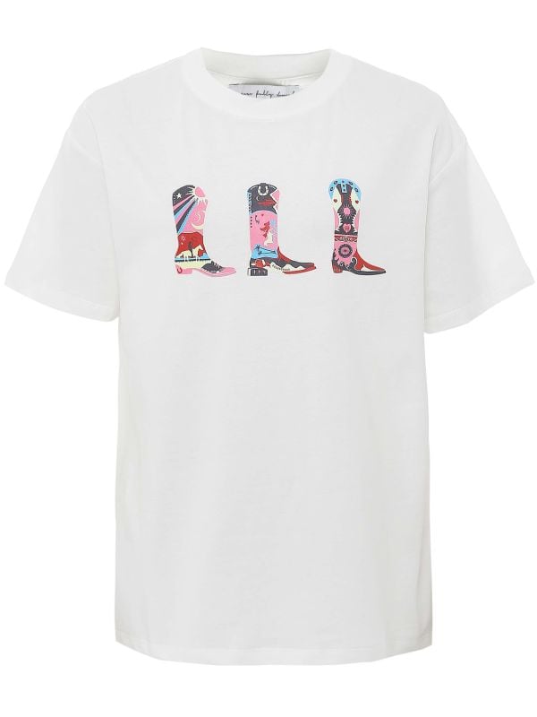 The Never Fully Dressed Cowboy Boot T-Shirt is a relaxed, short-sleeved tee cut for an easy, boxy silhouette. It features a crew neckline and a playful chest print of three stylised cowboy boots that lends character to casual outfits. The straight hem falls cleanly with a slight curve at the back for added coverage. Wear it tucked into high-waist Pants, layered under jackets or with denim for an off-duty edit that balances comfort with personality. Ideal for weekend plans or relaxed city days, it updates everyday looks with a playful note.
