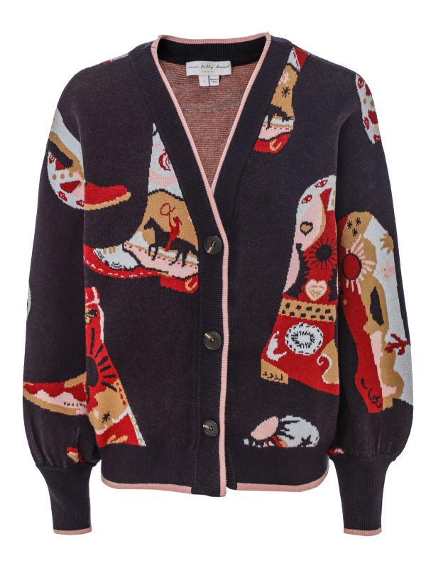 The Cowboy Boots Cardigan from Never Fully Dressed features an all-over western boot jacquard in a knitted construction. Finished with a V-neck and three-button front, the cardigan has ribbed trims and contrast piping for a neat edge. Balloon-style long sleeves gather into fitted cuffs, while the relaxed silhouette layers easily over shirts or dresses. Wear it with denim or a coordinating skirt for a complete look.