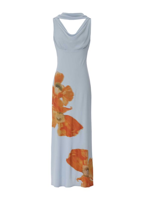 Never Fully Dressed's Floral Sophie Dress has a draped cowl neckline and a flowing backless tie that falls into long scarf-style panels. Cut on a figure-skimming silhouette, the maxi falls to the floor with a side leg slit and placed floral print. The sleeveless shape and soft drape create movement while a defined waist offers subtle shaping. Style with minimal Jewelry and sandals to complete an event-ready look. Ideal for weddings, summer gatherings, destination celebrations and holiday evenings.